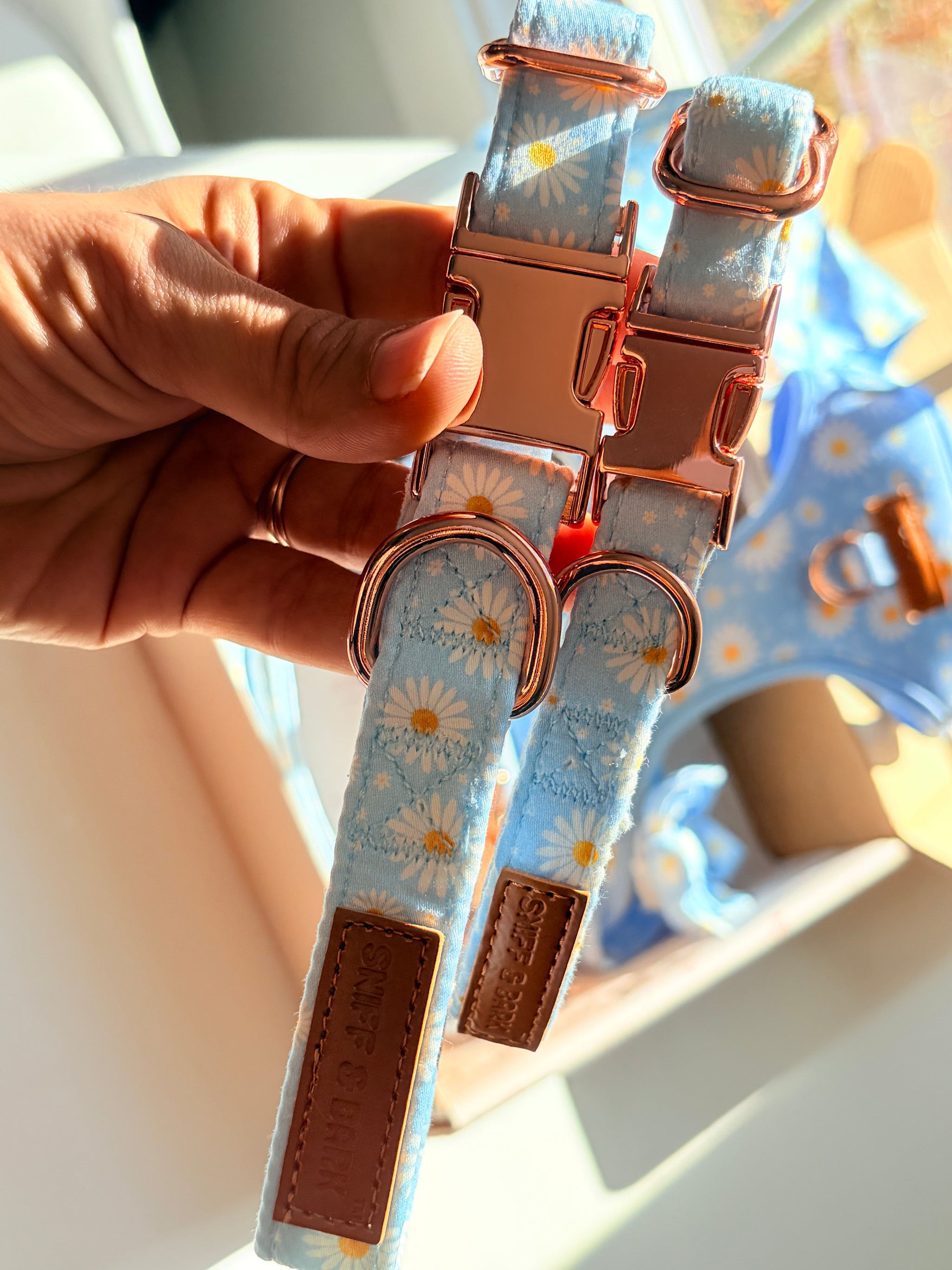 Collar + Leash: Since our collars and leashes have metal on them, machine wash is not recommended. For best result - spot clean with water and soap. Air dry.